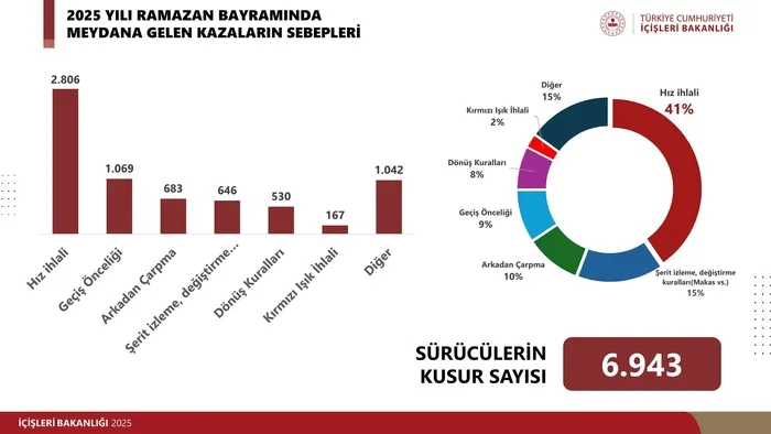 İçişleri Bakanı Ali Yerlikaya, Ramazan Bayramı tatili süresince trafik güvenliği konusunda alınan önlemleri ve yaşanan kazalara ilişkin çarpıcı verileri kamuoyuyla paylaştı. 9 günlük bayram tatilinde 6 bin 268 ölümlü ve yaralanmalı trafik kazası meydana gelirken, olay yerinde 74 kişi hayatını kaybetti, 10 bin 199 kişi de yaralandı. Kazaların yüzde 41’inin sebebi “aşırı hız” olarak kayıtlara geçti. Diğer kazaların sebepleri arasında geçiş önceliği ihlali, arkadan çarpma, şerit ihlali, dönüş kurallarına uymama ve kırmızı ışık ihlali yer aldı.
