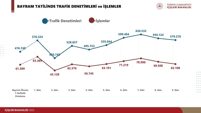 25 Mart’ta tüm valiliklere gönderilen “Trafik Tedbirleri” genelgesiyle start verilen denetim seferberliği, 26 Mart-8 Nisan tarihleri arasında 14 gün boyunca aralıksız sürdü. Bakan Yerlikaya, bu süreçte 69 bin 11 polis ve jandarma personelinin sahada görev yaptığını belirtti.