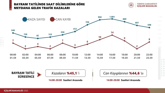 Tatil süresince gerçekleşen kazaların yüzde 45’inin 14.00 ila 20.00 saatleri arasında meydana geldiğini belirten Yerlikaya, bu saat diliminde hayatını kaybedenlerin oranının da yüzde 44,6 olduğunu vurguladı. “Bir saniyelik sabır, bir canı kurtarabilir” diyen Yerlikaya, emniyet kemeri kullanımının hayati önem taşıdığını bir kez daha hatırlattı.