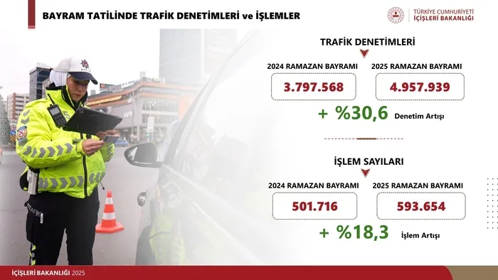 Toplamda 4 milyon 957 bin 939 araç denetimden geçti. Kurallara uymayan 593 bin 654 sürücüye cezai işlem uygulandı. 48 bin 21 araç trafikten men edilirken, 7 bin 720 sürücünün ehliyetine el konuldu. Bu rakamlarla geçen yıla göre denetimlerin yüzde 30,6 oranında arttığı vurgulandı.